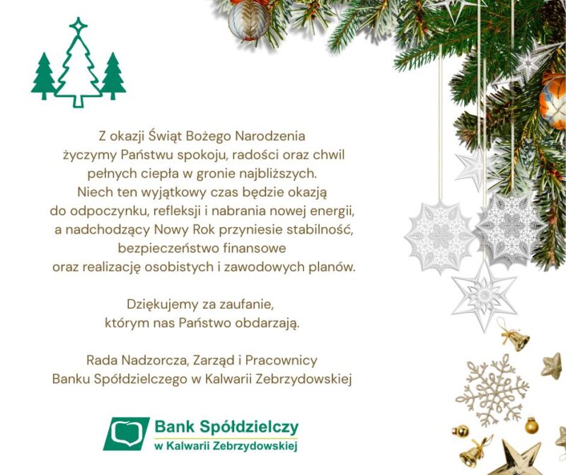 Szanowni Państwo, informujemy, iż w dniu 31 grudnia 2025 r. Bank Spółdzielczy w Kalwarii Zebrzydowskiej będzie czynny do godz. 13:30. Rozliczenia międzybankowe Elixir wysłane [...]